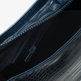 Sac à bandoulière en forme de lune fabriqué à partir de matériaux partiellement recyclés. Le sac contient un compartiment avec trois poches intérieures et une fermeture à glissière sur le dessus.