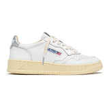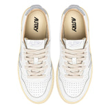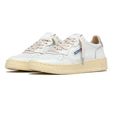 Les Autry Medalist Low – White / Silver Bold pour femmes proposent une interprétation élégante et contemporaine de la sneaker tennis iconique de la marque. La tige en cuir blanc lisse est rehaussée par un empiècement talon argenté (heel tab), situé au-dessus du contrefort, sur lequel figure le logo AUTRY dans une typographie bold, affirmant le caractère du modèle.